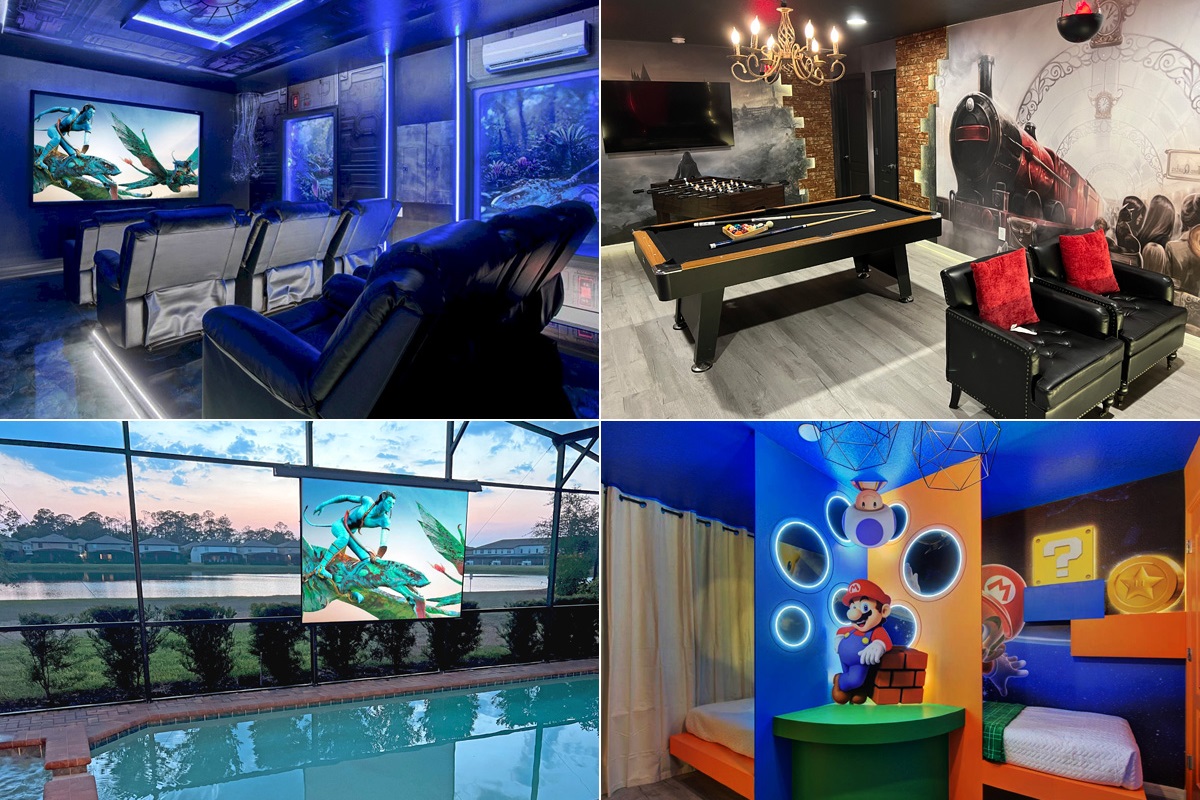Home Highlights: Avatar Theme Movie Theater - Harry Potter Theme Game Room - Outdoor Poolside Theater w/Bar, Mini Fridge & TV - Private West Facing Heated Pool/Spa (heating extra $) With Beautiful View Of Large Pond Behind - Covered Lanai With Plenty Of Seating For Lounging And Dining - Kids Playroom (under the stairs) - 3 King Suites - 3 Themed Kids' Bedrooms (Super Mario, Little Mermaid, and Pirates)